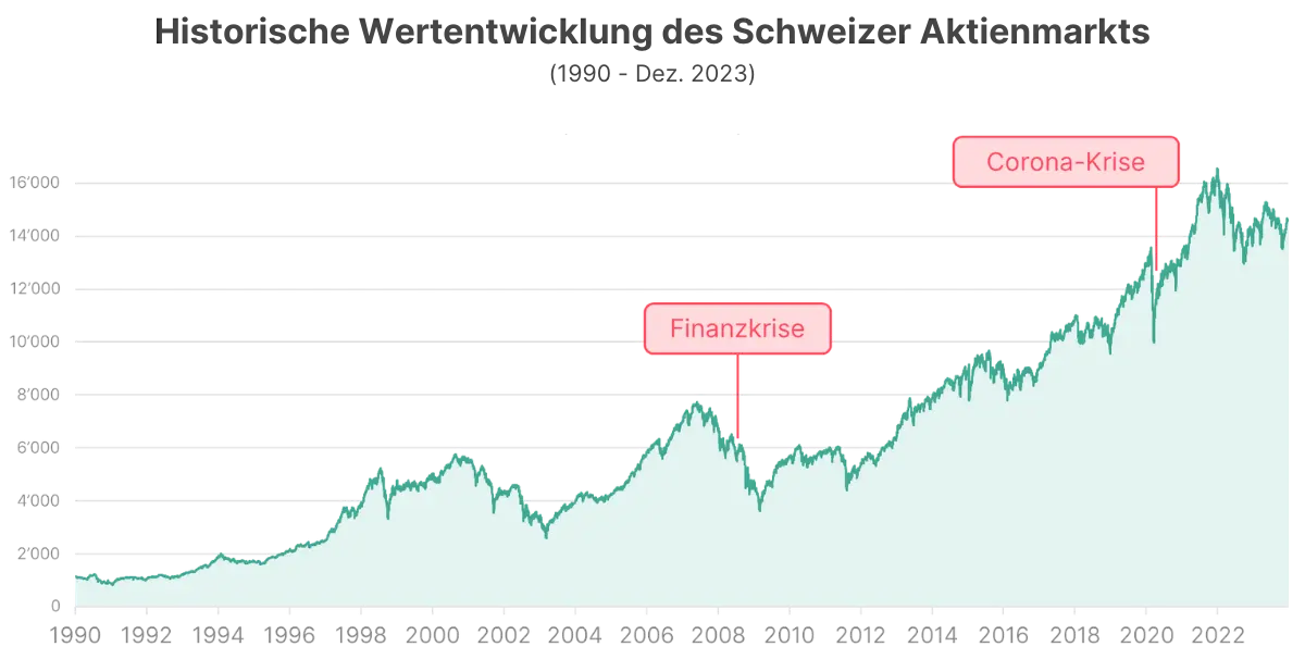 Egal wann, wie lange und wie stark es bisher an den Finanzmärkten rüttelte und schüttelte – bisher folgte nach jeder Krise noch immer eine Erholung. Das zeigt der Blick in die Vergangenheit. Hier als Beispiel die historische Wertentwicklung des Schweizer Aktienmarkts.