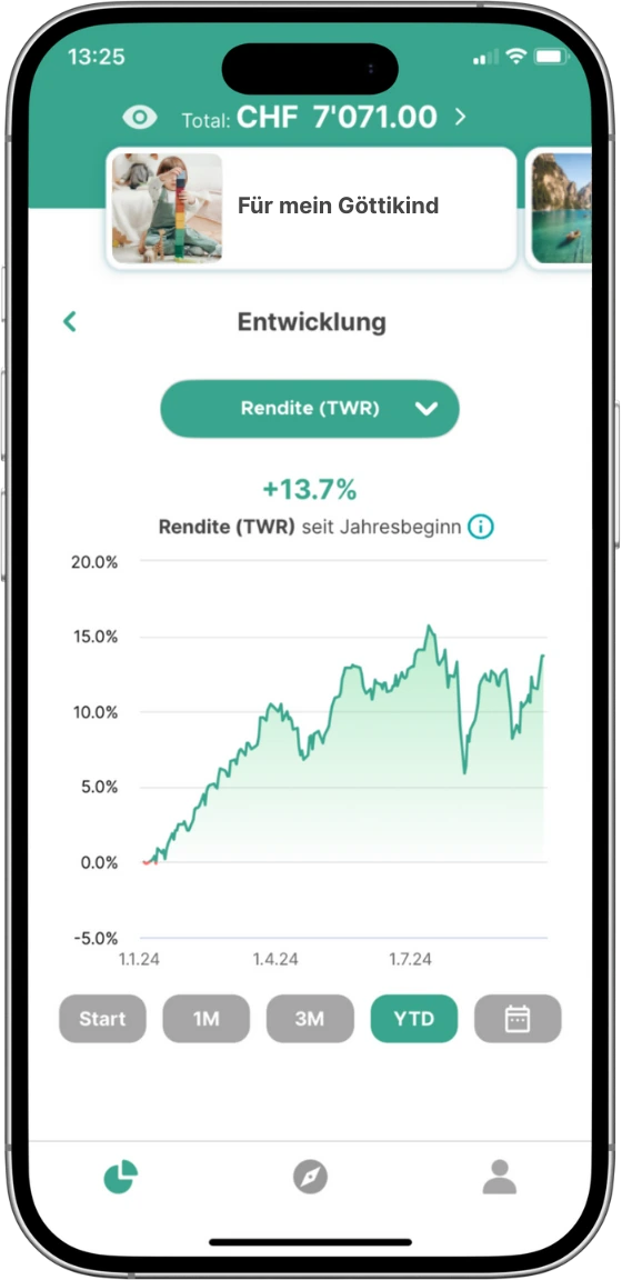 Du möchtest für deinen Nachwuchs, dein Gotti-, Götti- oder Enkelkind ein Polster schaffen, damit es später mit Rückenwind ins Erwachsenenleben starten kann? Ob als Zustupf für das erste Auto, die eigene Wohnung oder eine unvergessliche Weltreise – mit unseren Anlagelösungen aus kostengünstigen ETFs macht Sparen für die nächste Generation einfach mehr Sinn als auf einem mickrigen Sparkonto.