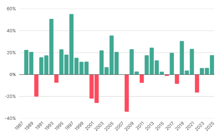 Quelle: SIX, Total Return Index des SPI 1988 -2025, d.h. inkl. reinvestierten Dividenden
