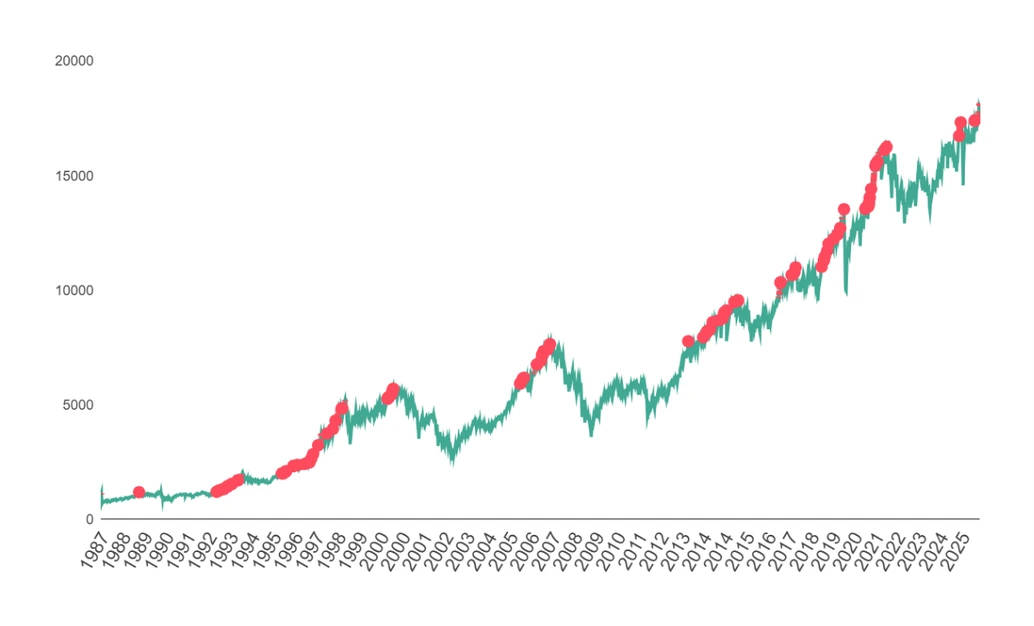 Die folgende Grafik zeigt den Verlauf der Gesamtperformance des SPI. Alle roten Datenpunkte markieren dabei Tage, die auf einem Allzeithoch endeten: