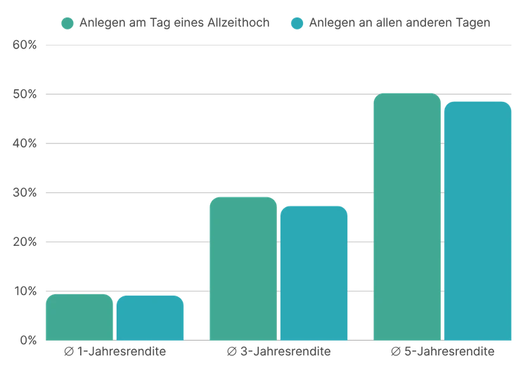 Die Analyse ist schnell gemacht: Es gibt kaum Unterschiede. Wer genau hinschaut, erkennt, dass es durchschnittlich sogar leicht besser ist, an Tagen mit Allzeithoch anzulegen.