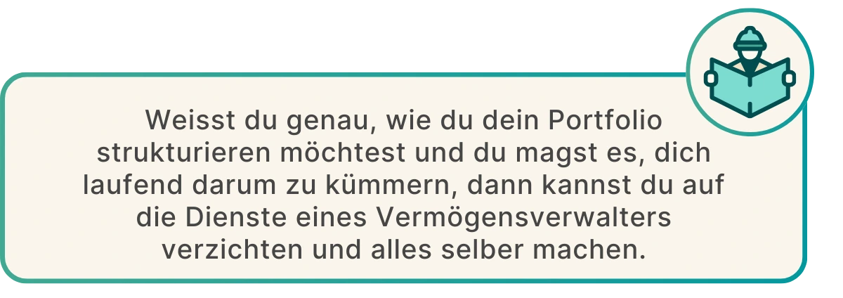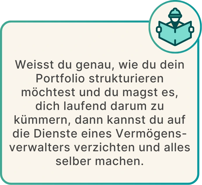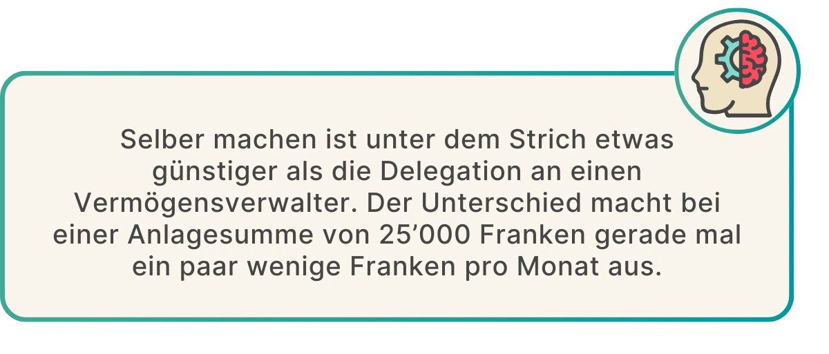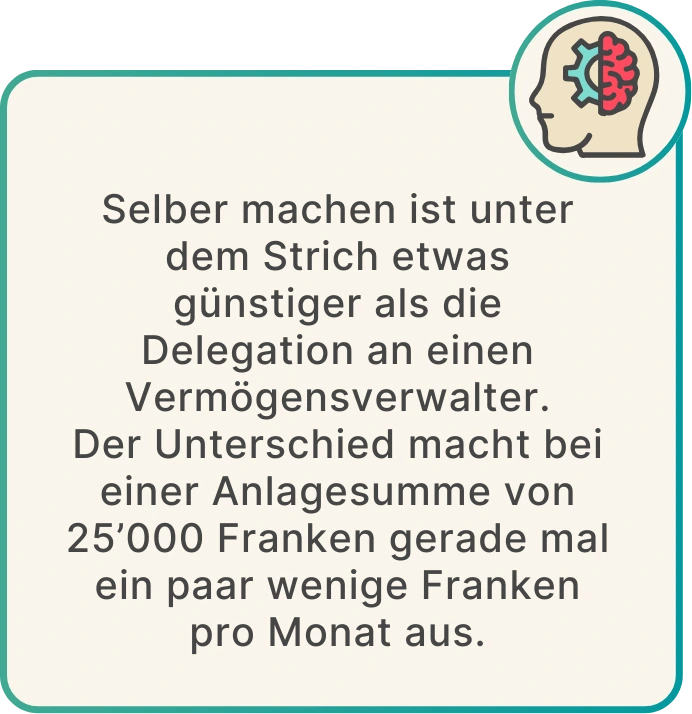 Das beantworten wir dir mit diesem Artikel und geben dir Entscheidungshilfen an die Hand. Damit das Ganze übersichtlich bleibt, haben wir meist beiden Varianten direkt sämtliche relevanten Kriterien gegenübergestellt, links immer «do-it-yourself» und rechts die Delegation an einen Vermögensverwalter.