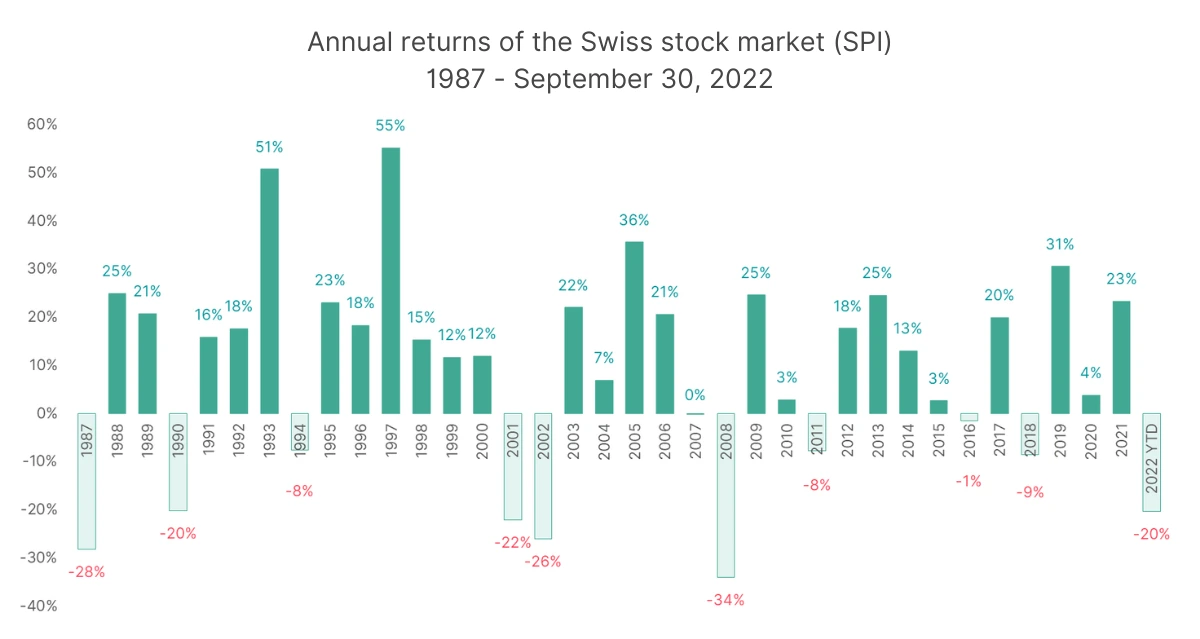 The calculations are based on the assumption that the return is 5% per year and is achieved regularly and at a constant level from the first year of investment. In reality, your investment will generate a net average annual return of around 5% over 10 years. However, there will be years with negative returns and then there will also be very good years. For example, the largest annual loss ever recorded in the Swiss stock market (Swiss Performance Index SPI) was -34% (2008), while the largest annual gain was +55% (1997).