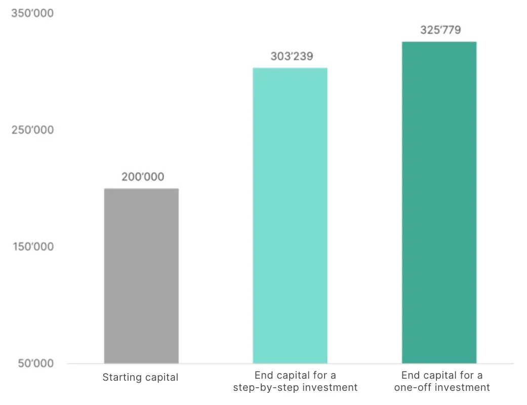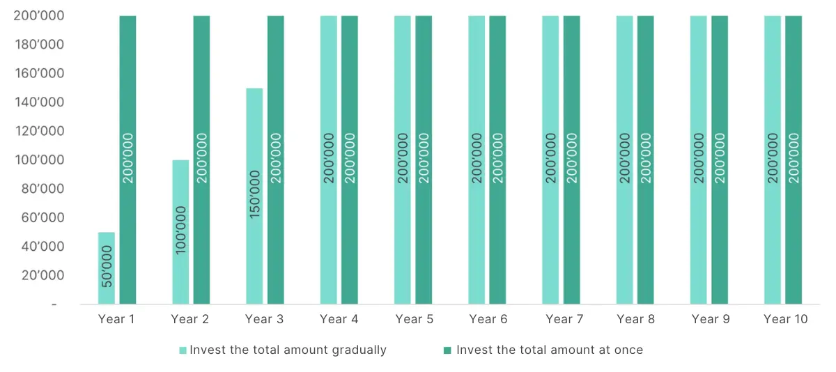 With a one-time investment, your entire capital is invested over the entire investment period. In this example, that is 200’000 francs. With a gradual investment, you invest 50’000 francs over each of the first four years.