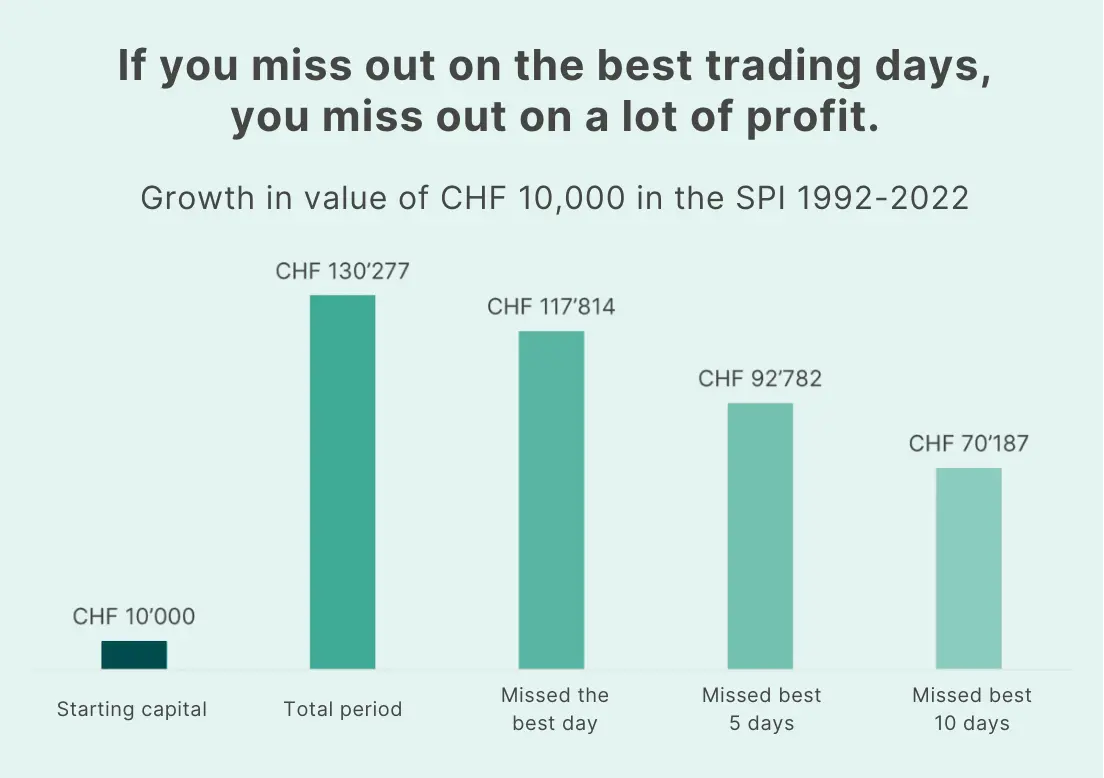 You might also think that it’s a good time to invest money now, but that there might be an even better time in the future. However, with this approach you also accept the risk of missing out on good stock market days. This in turn has an impact on your long-term return, as the chart below shows.