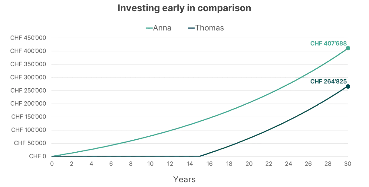 The chart below illustrates the importance of starting to invest as early as possible. Anna and Thomas both invested the same amount of money every month. However, after 30 years Anna has almost twice as much fortune as Thomas. Even if you start “only” 15 years later, it can cost you half of the potential fortune. This example should illustrate the importance of early investment timing.