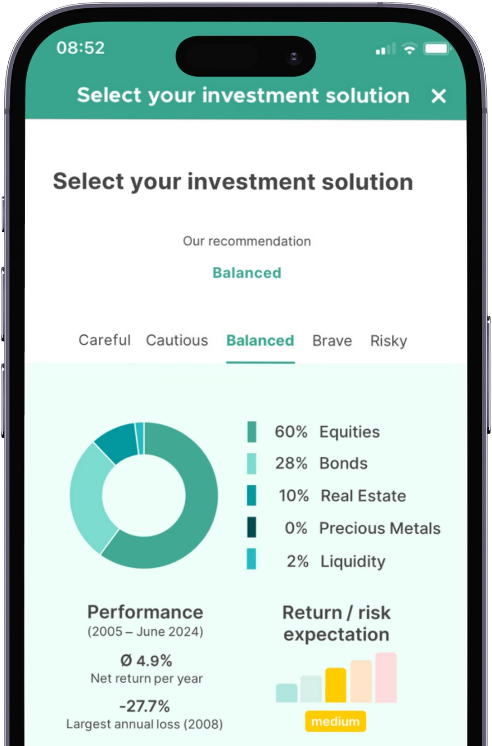 Our quick questionnaire will assess your risk profile and recommend an investment solution for you. Don’t worry – you can always switch to a different one. Starting from CHF 5’000 you can also create your own investment solution to fit your personal needs.