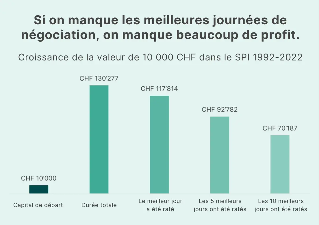 De telles corrections peuvent être importantes. Si l’on rate ne serait-ce que quelques-unes des meilleures journées boursières, les pertes de rendement sont importantes. C’est ce que souligne le graphique suivant.