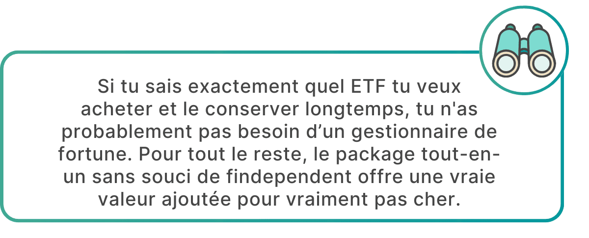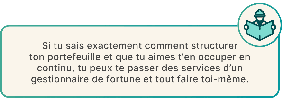 Nous répondons à ces questions dans cet article et te fournissons des éléments pour t’aider à prendre ta décision. Pour que tout reste clair, nous avons comparé directement les deux options en fonction de tous les critères pertinents, à gauche le « do-it-yourself » et à droite la délégation à un gestionnaire de patrimoine.
