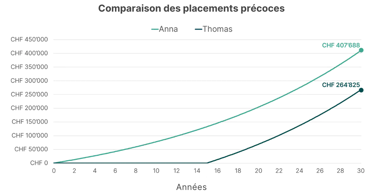 Le graphique ci-dessous illustre l’importance de commencer à investir le plus tôt possible. Anna et Thomas ont tous les deux investi la même somme d’argent chaque mois. Cependant, après 30 ans, Anna a presque deux fois plus d’actifs que Thomas. Même si tu commences « seulement » 15 ans plus tard, cela peut te coûter la moitié des actifs potentiels. Cet exemple illustre l’importance d’un placement précoce.