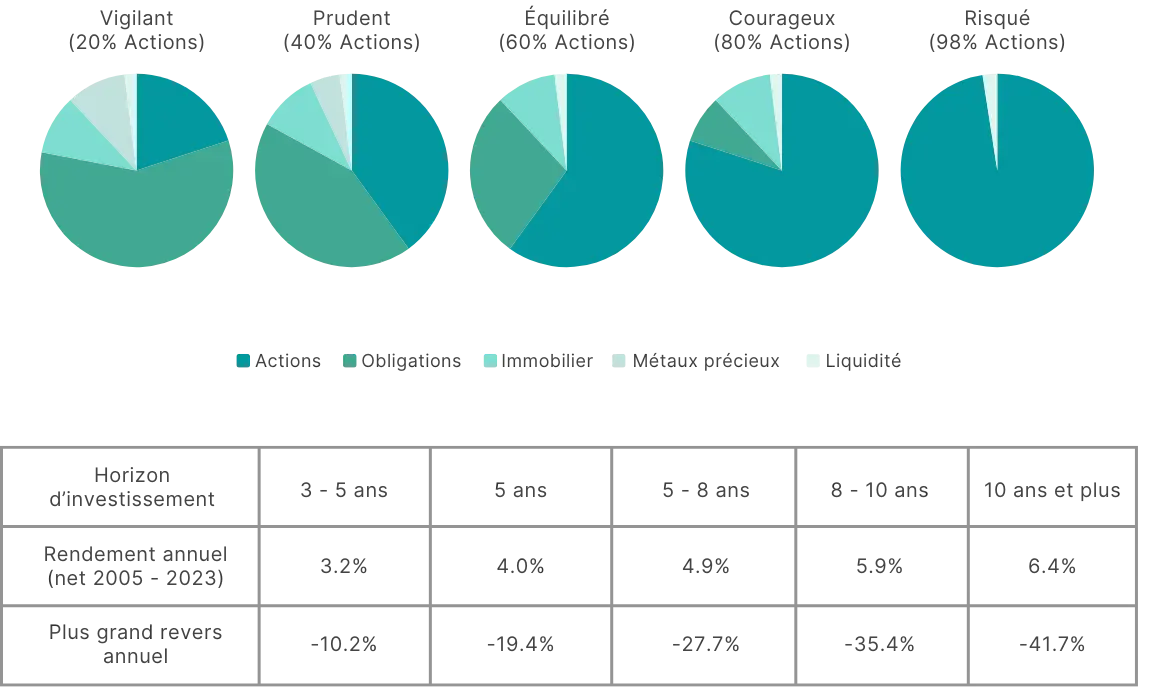 Les stratégies d’investissement varient en termes de durée d’investissement, de fluctuations de valeur et de rendement attendu ainsi qu’historique. Pour les solutions d’investissement findependent, cela se présente comme suit :