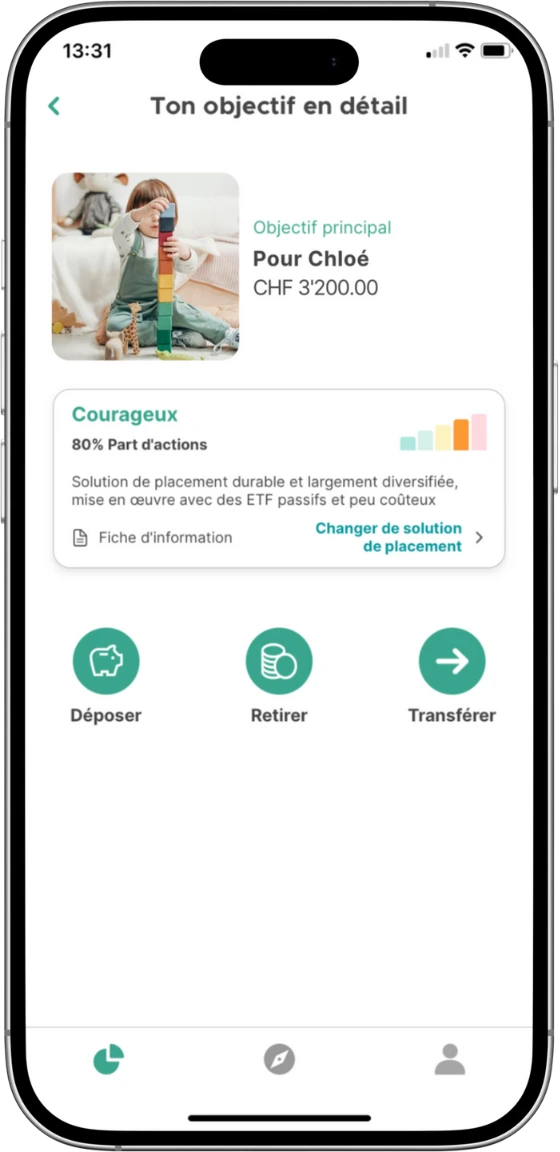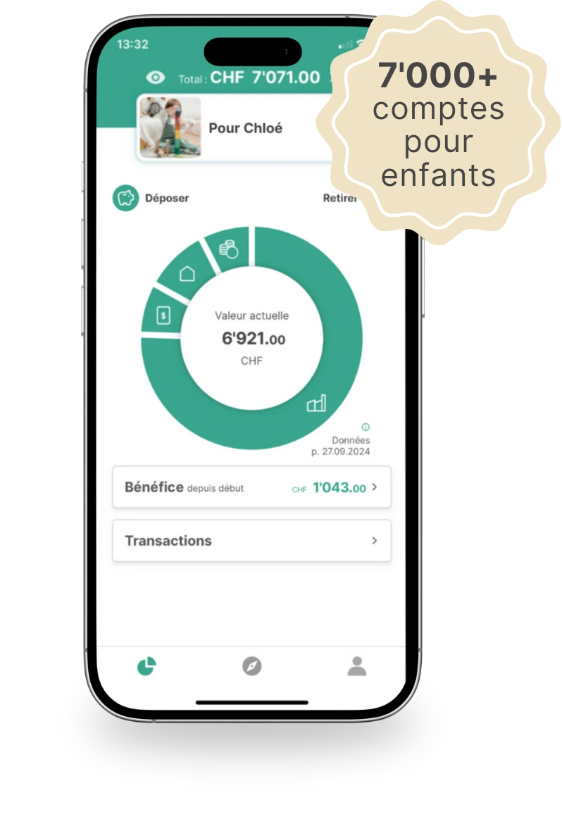 Tu souhaites créer un petit nid douillet pour tes enfants, tes filleuls ou tes petits-enfants afin qu’ils puissent plus tard démarrer leur vie d’adulte avec le vent en poupe ? Qu’il s’agisse d’un coup de pouce pour la première voiture, leur propre appartement ou un voyage inoubliable autour du monde – avec nos solutions d’investissement composées d’ ETF à bas prix, épargner pour la prochaine génération a simplement plus de sens que sur un compte d’épargne dérisoire.