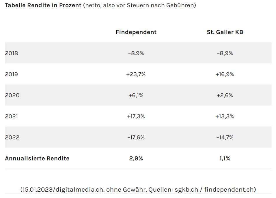 Die Gebührenhöhe zu vergleichen, ist die eine, relativ einfache Sache. Um einen vollständigen und fairen Vergleich zu machen, ist es ebenso wichtig, einen Blick auf die eigentliche Leistung der Anlagestrategie zu werfen. Denn auch bei der Rendite gilt es, nicht Äpfel mit Birnen zu vergleichen. Wir verweisen nochmals auf Patrick Huber. Er hat sich die Mühe gemacht, die Renditen der vergangenen Jahre direkt zu vergleichen. Auf der einen Seite steht findependent mit einer vollständig digitalen Anlagelösung mit ETFs und verfügbar als App. Auf der anderen Seite die St. Galler Kantonalbank mit einem Vermögensverwaltungsmandat, welches in passive Aktien- und Obligationenfonds investiert.