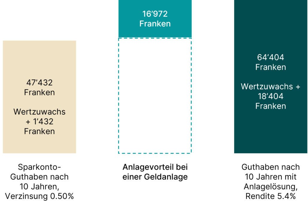 Über 10 Jahre hinweg gesehen ergibt das, aufgrund des Zinseszinseffektes, eine Renditedifferenz von 17’199 Franken.