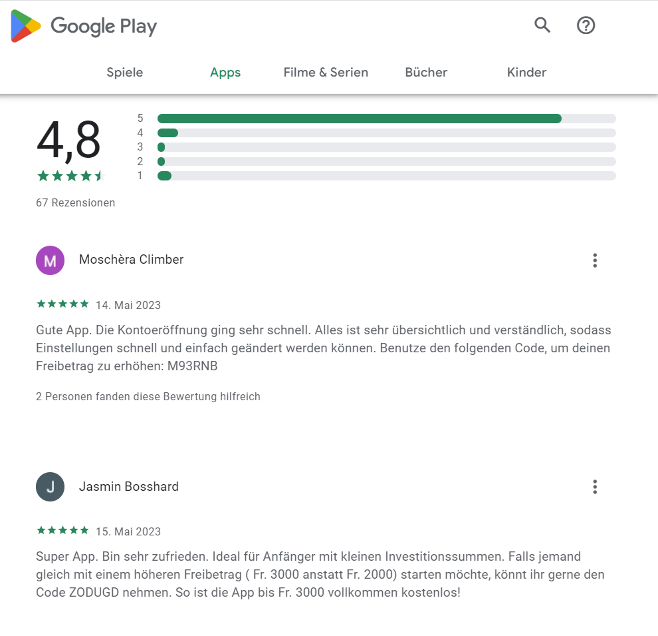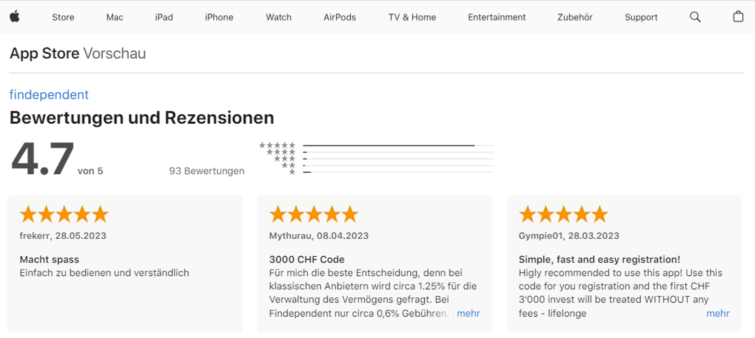 Und auch im App Store sowie im Google Play Store schneidet die findependent Anlage-App gut ab.